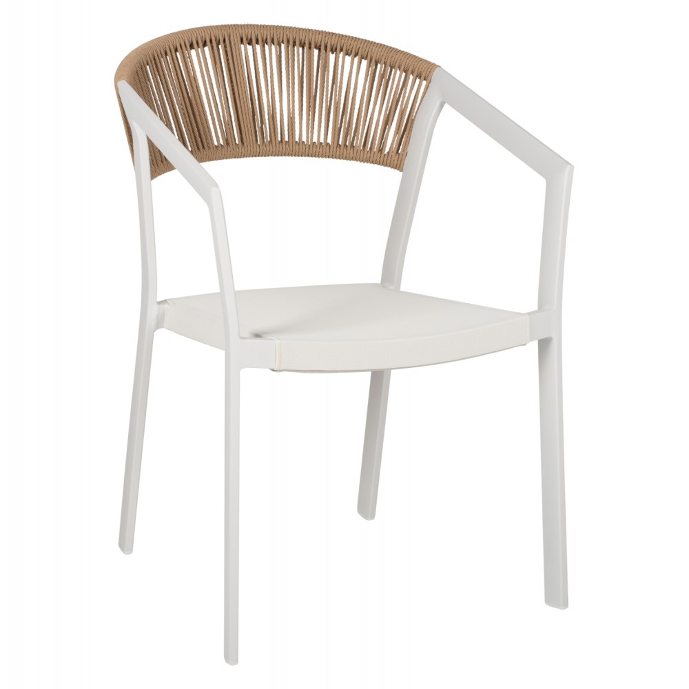 Μοντέρνα πολυθρόνα, κατασκευασμένη από σκελετό αλουμινίου σε λευκή απόχρωση, επενδυμένημε πλεκτό ενισχυμένο PE σχοινί στο κάθισμα και στην πλάτη σε μπεζ απόχρωση.