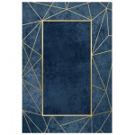 Αυτό το όμορφο και μοντέρνο χαλί έχει κυρίαρχα χρώματα το μπλε σε όλη την επιφάνεια του χαλιού, και το χρυσό σε όλες τις γραμμές της μπορντούρας. Το έντονο χαρακτηριστικό του είναι το μπλε ορθογώνιο στο κέντρο του χαλιού που μοιάζει με καθρέφτη με χρυσό πλαίσιο και χρυσά τριγωνικά σχέδια τριγύρω. Ένα μοντέρνο χαλί που θα τραβήξει τα βλέμματα και θα αναβαθμίσει αισθητικά το σαλόνι σας.